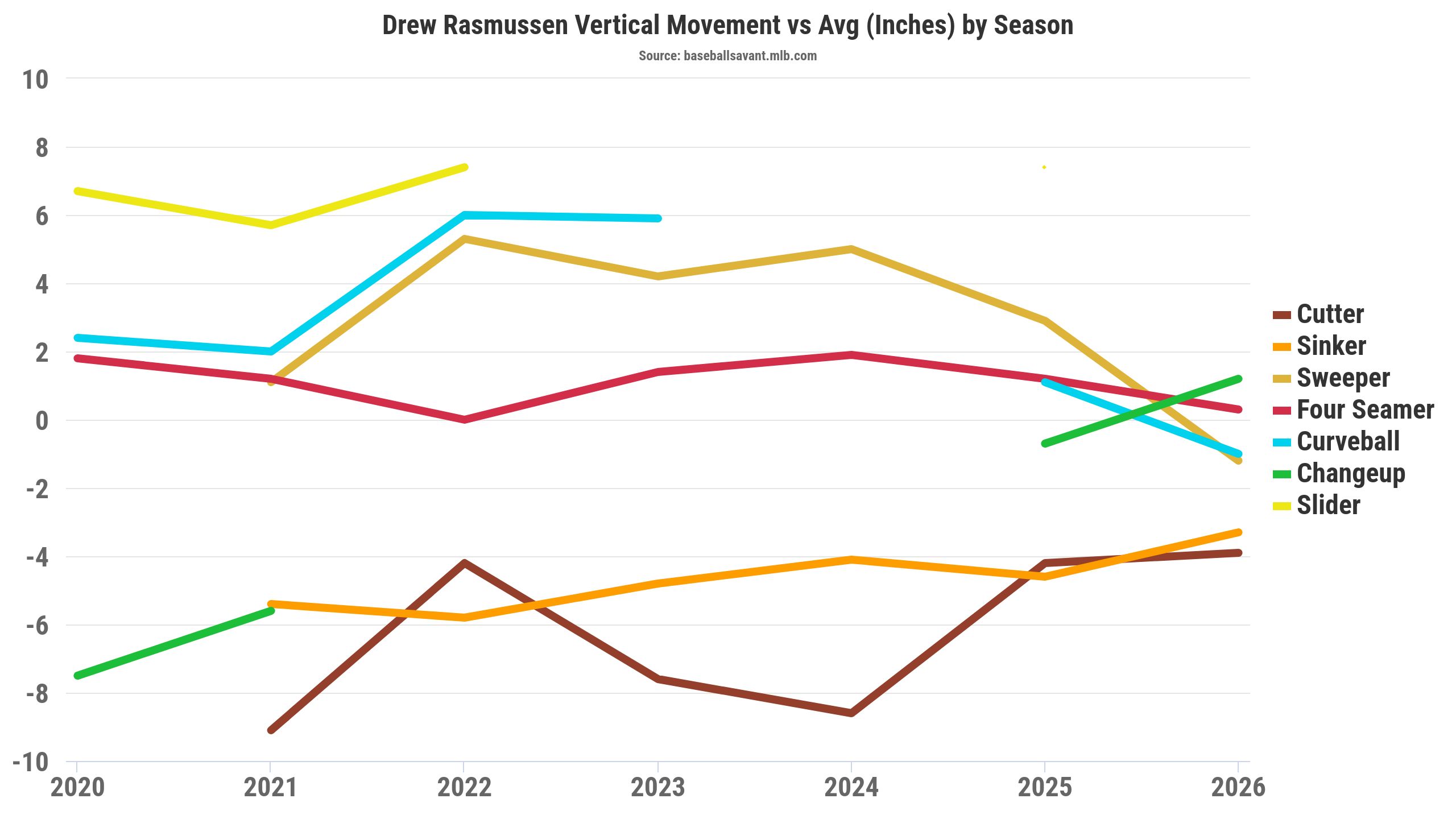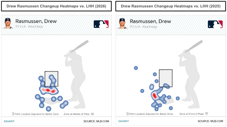 Rasmussen's changeup has a 106 Stuff+ in 2026, down from 117 in 2025. However, Rasmussen's locations were problematic with a 91 Location+ in 2025, improving to a 108 Location+ in 2026. It's such a small sample of 45 changeups thrown, so monitor this pitch mix and movement change.
