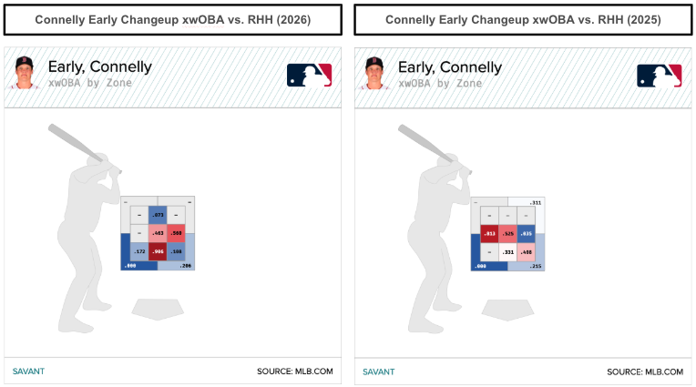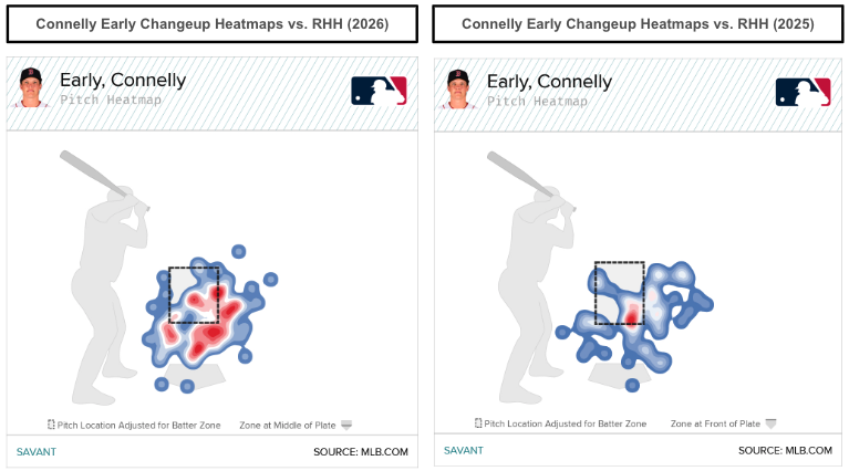 Interestingly, Early's changeup heatmaps against right-handed hitters look more scattered in 2026, yet he maintained a Location+ of around 113-114 in 2025 and 2026. When Early leaves it in the heart of the zone, right-handed hitters crush it.
