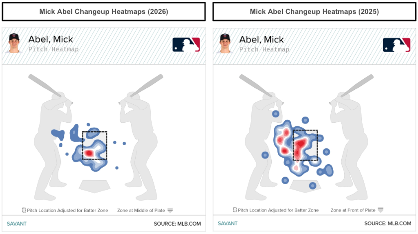 Abel's changeup added over two inches of downward movement while maintaining the arm-side fade at a slightly lower velocity (over 1 mph slower) in 2026. From the changeup heatmaps in 2025 and 2026, it appears that Abel might be commanding the pitch better in 2026.