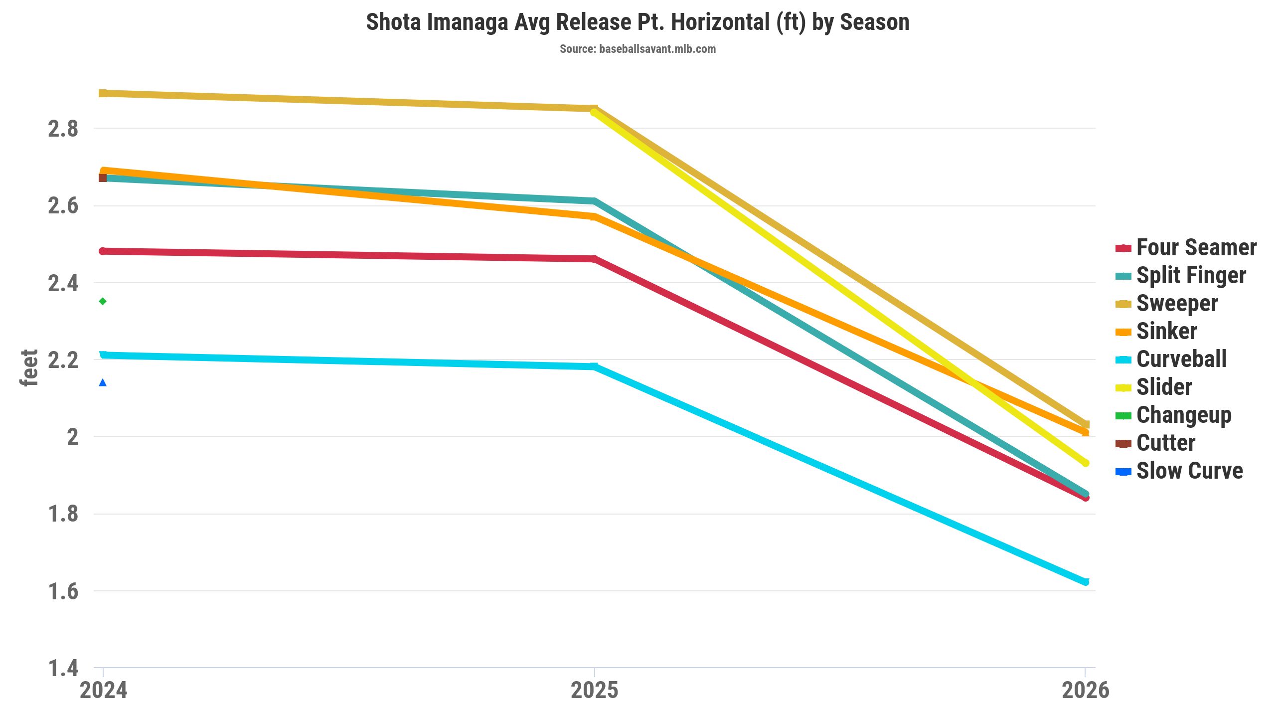 We're dealing with a small sample in 2026, so it's understandable to be skeptical. However, we want to highlight that Imanaga is throwing from a higher arm angle again (40 degrees). That said, we noticed Imanaga maintained his vertical release point and brought his horizontal release over eight inches closer to his midline in 2026.