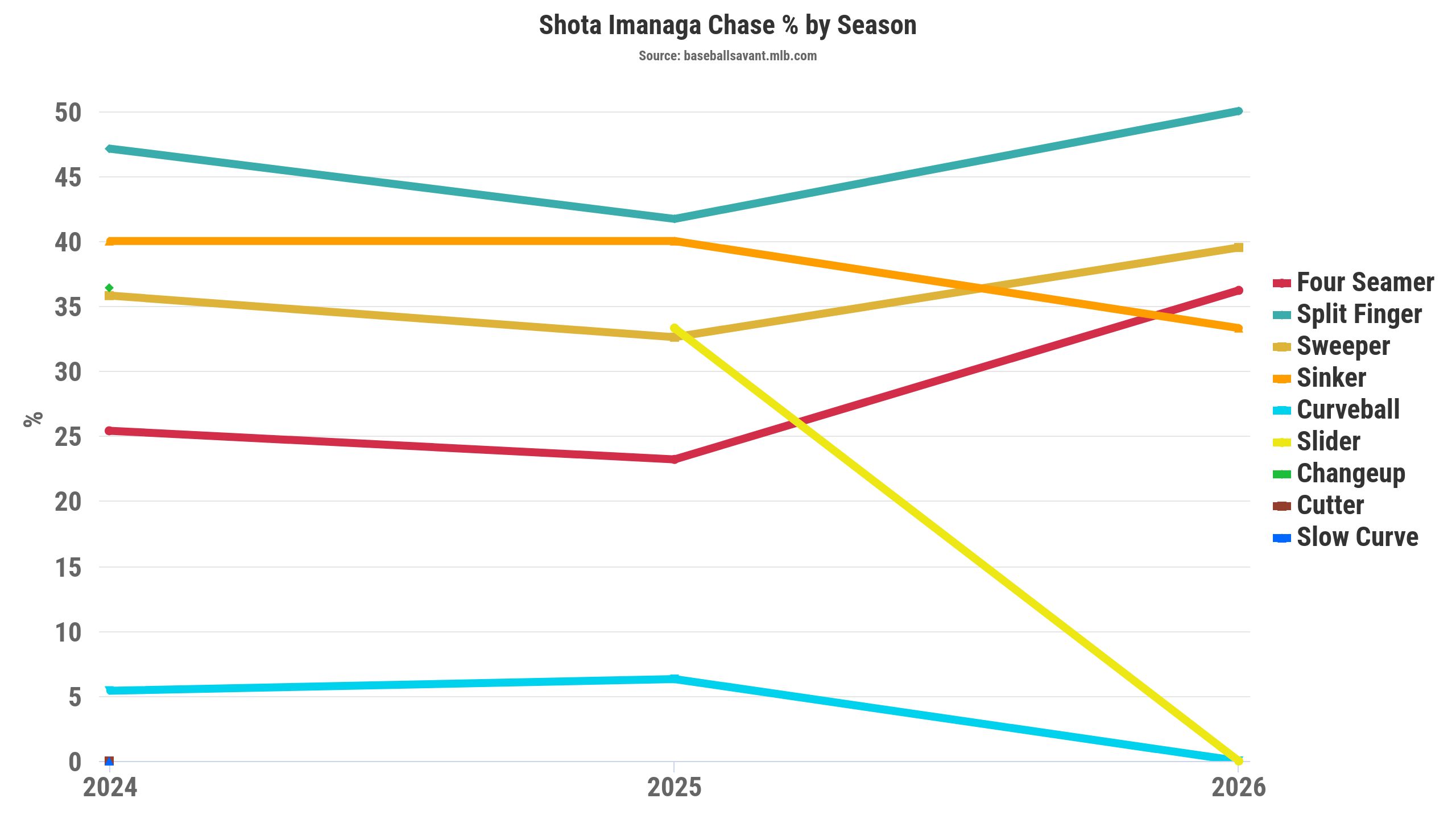 Imanaga has been throwing the splitter and sweeper less often in the zone in 2026, potentially leading to more chases outside the zone. That's evident in Imanaga's splitter having a 32% zone rate and the sweeper at 28.3%. It coincides with hitters chasing the sweeper 39.5% of the time and a 50% chase rate via the splitter, which was a 7-8 point jump from 2025.