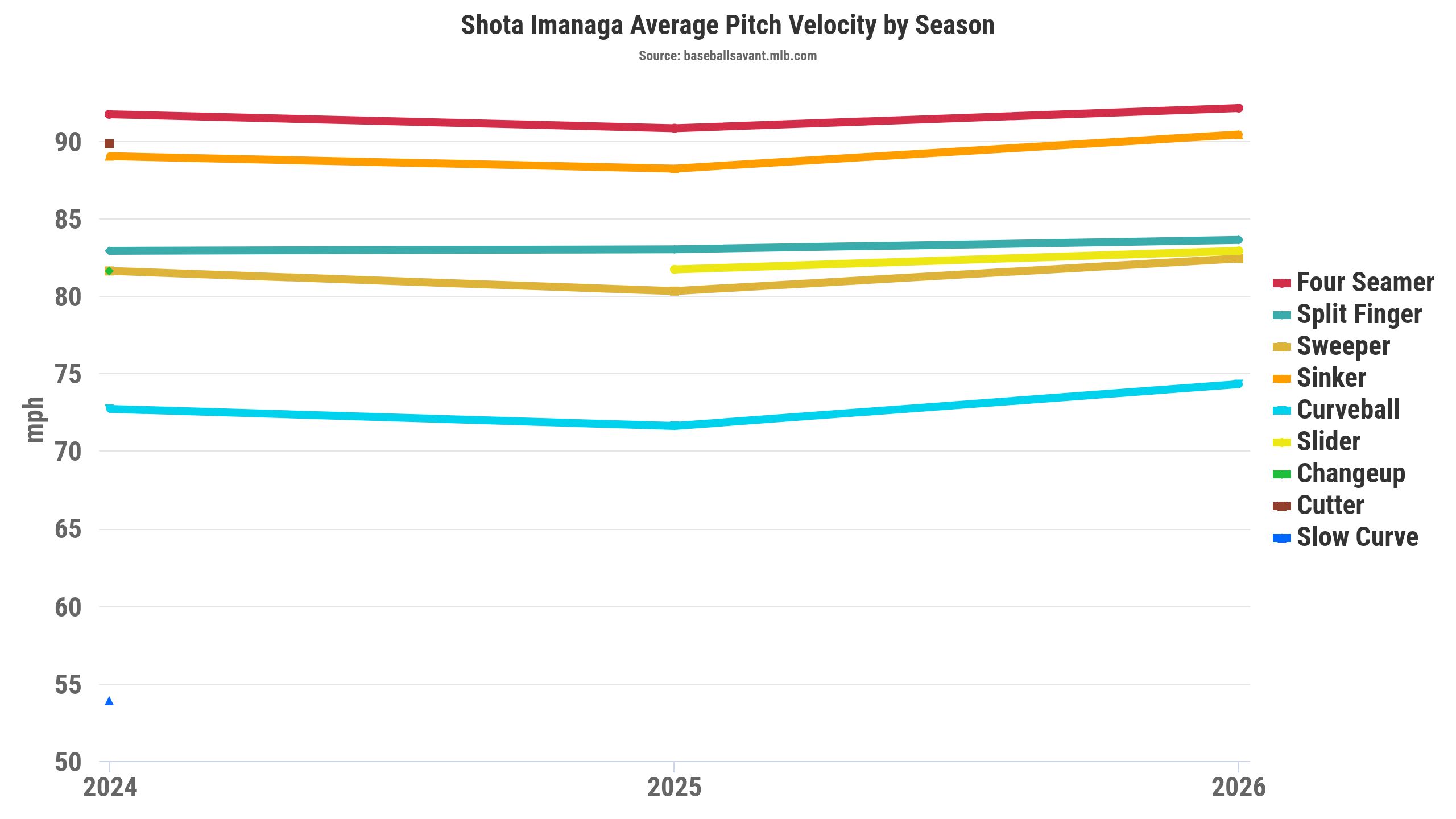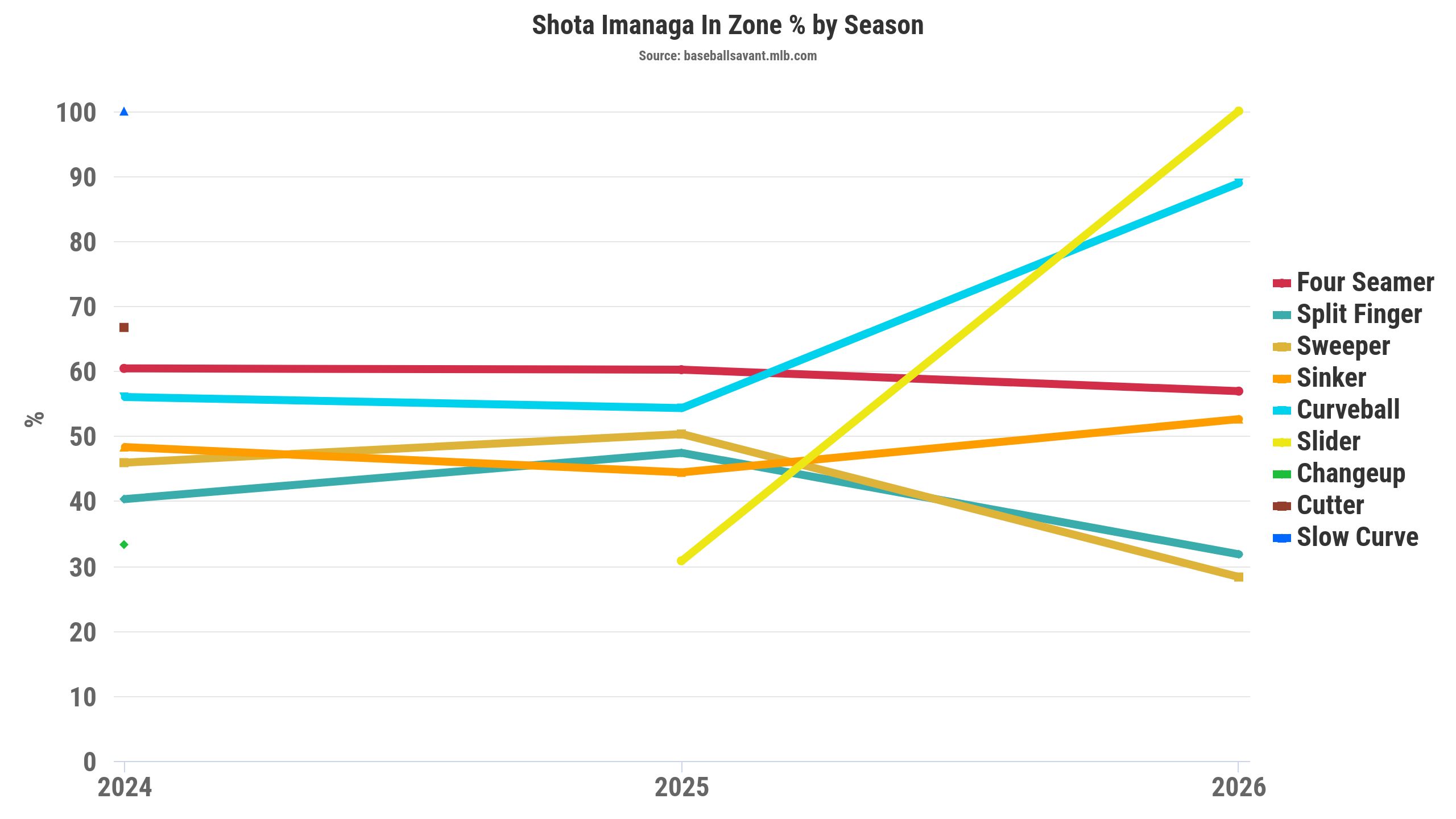 In the early 2026 sample, Imanaga's Location+ via the four-seam (121), splitter (115), and sweeper (145) or curveball on FanGraphs spiked across the board. For context, Imanaga's four-seam has a career 110 Location+, with the splitter at 109 and sweeper at 107, showing significant command improvements.