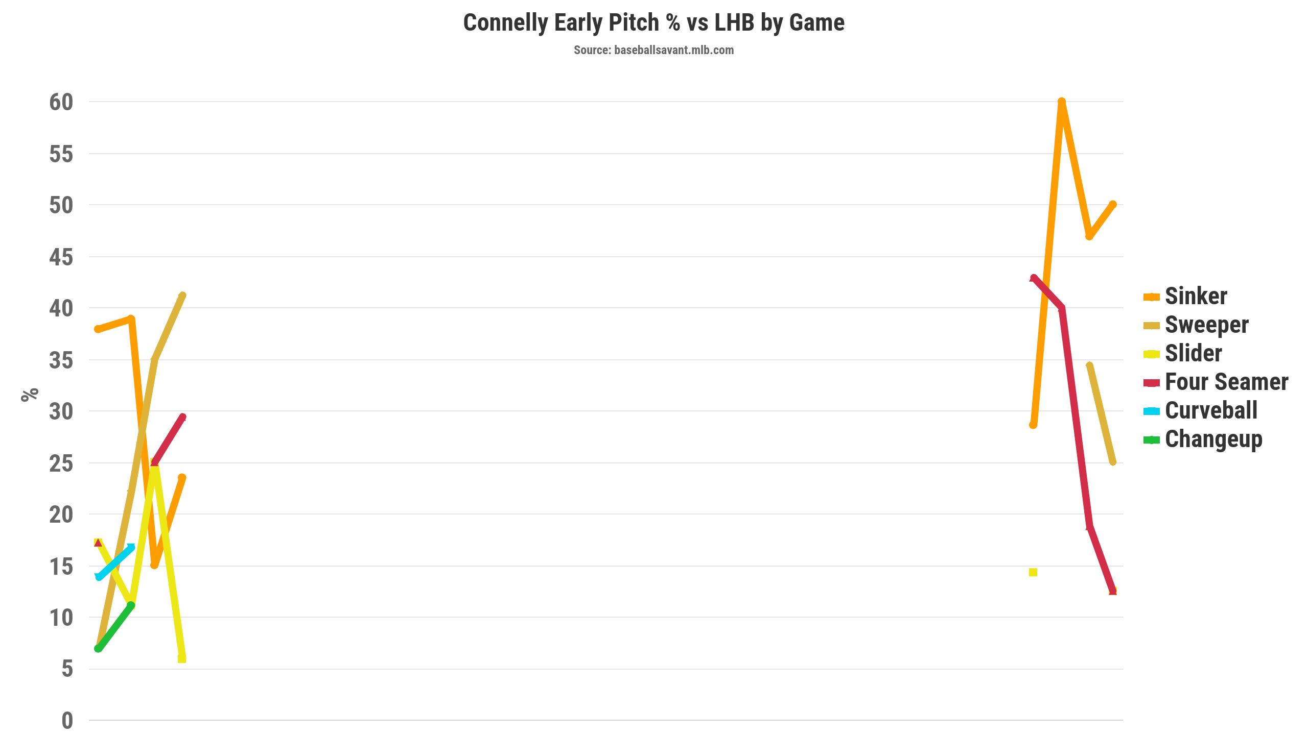 Early maintained his pitch mix against right-handed hitters, but made slight tweaks against lefties. He increased his sinker usage to 44.1% in 2026, compared to 29.8% in 2025 against left-handed hitters. With the additional sinkers, he ditched the slider usage from 15.5% (2025) to 5.1% (2026).