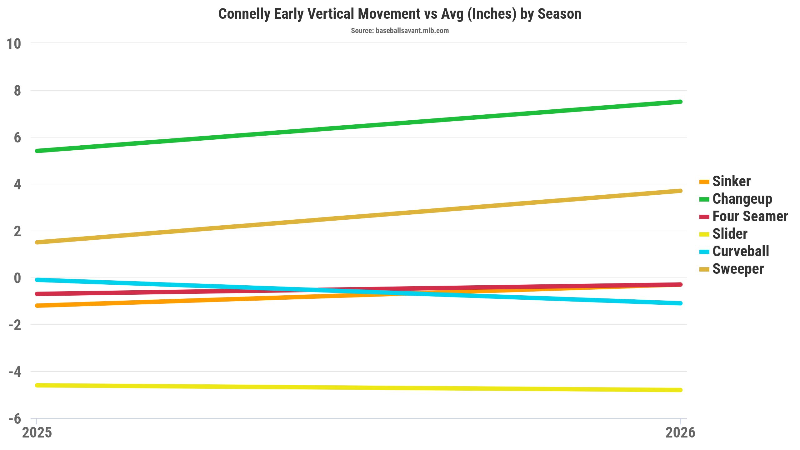 I expect Early's changeup to elicit more whiffs, especially since it added three inches of downward movement, making it an above-average pitch by Stuff+ grades, too. Besides Early's changeup adding downward movement, his sweeper also added nearly three inches of drop.