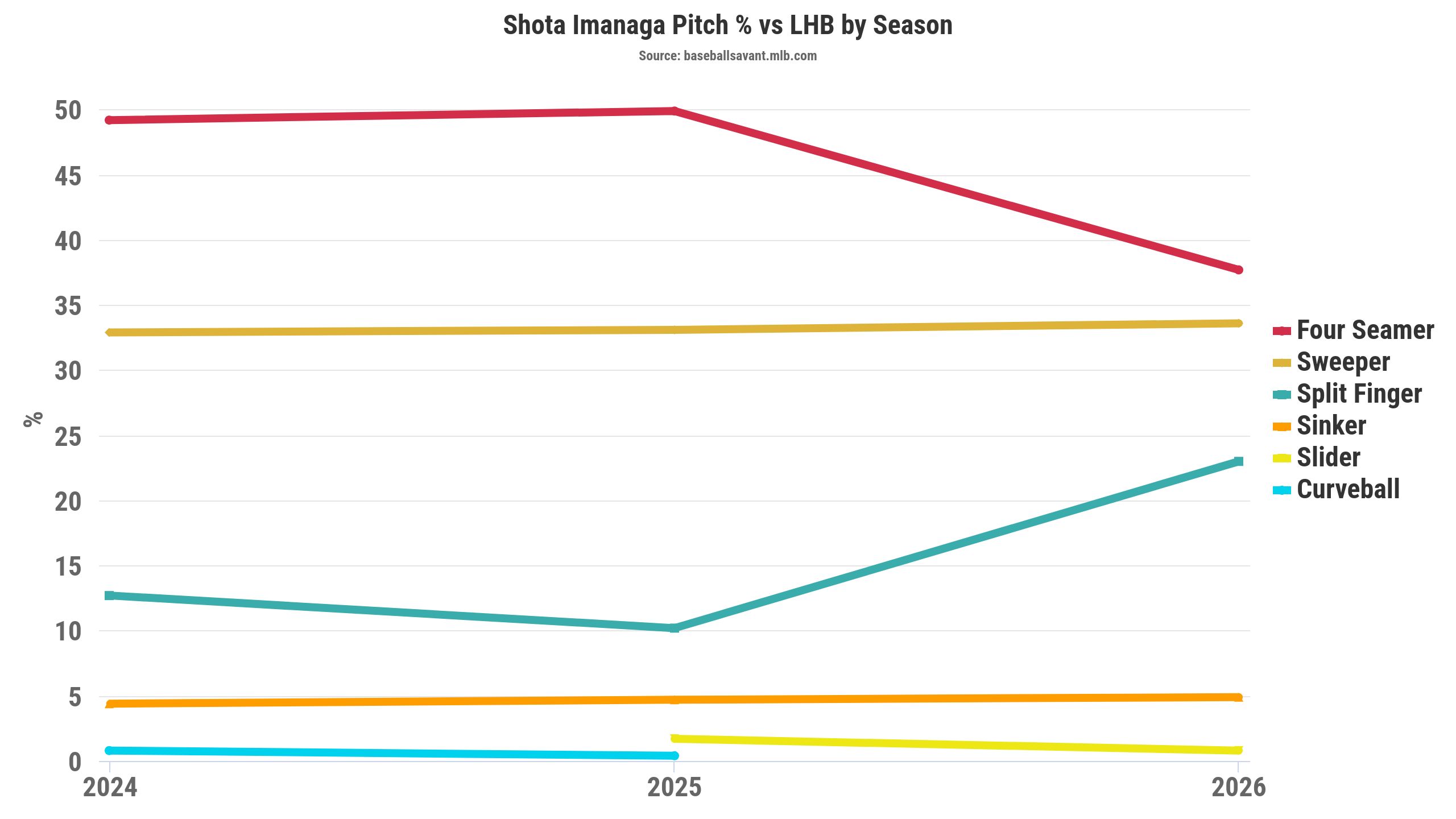 That's evident by throwing fewer four-seamers (37.7%), down 12 percentage points compared to the previous two seasons (49%). That coincided with Imanaga throwing more splitters against lefties (23%) in 2026, up from 10.2% in 2025. Imanaga's splitter generated a 25.6% swinging-strike rate in 2026, jumping back to the numbers from 2024.