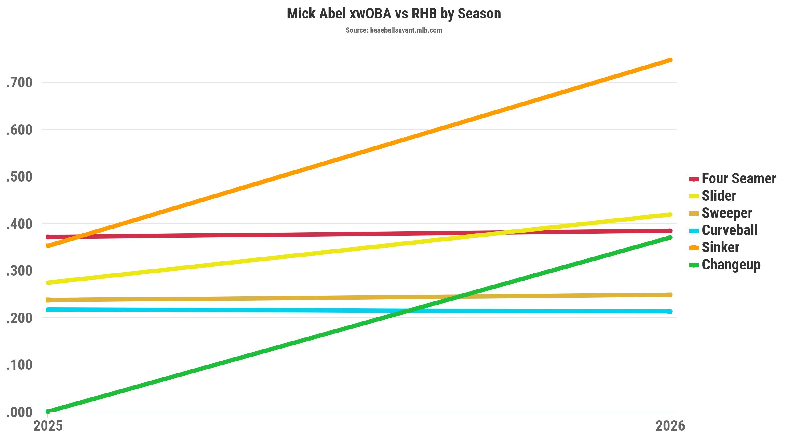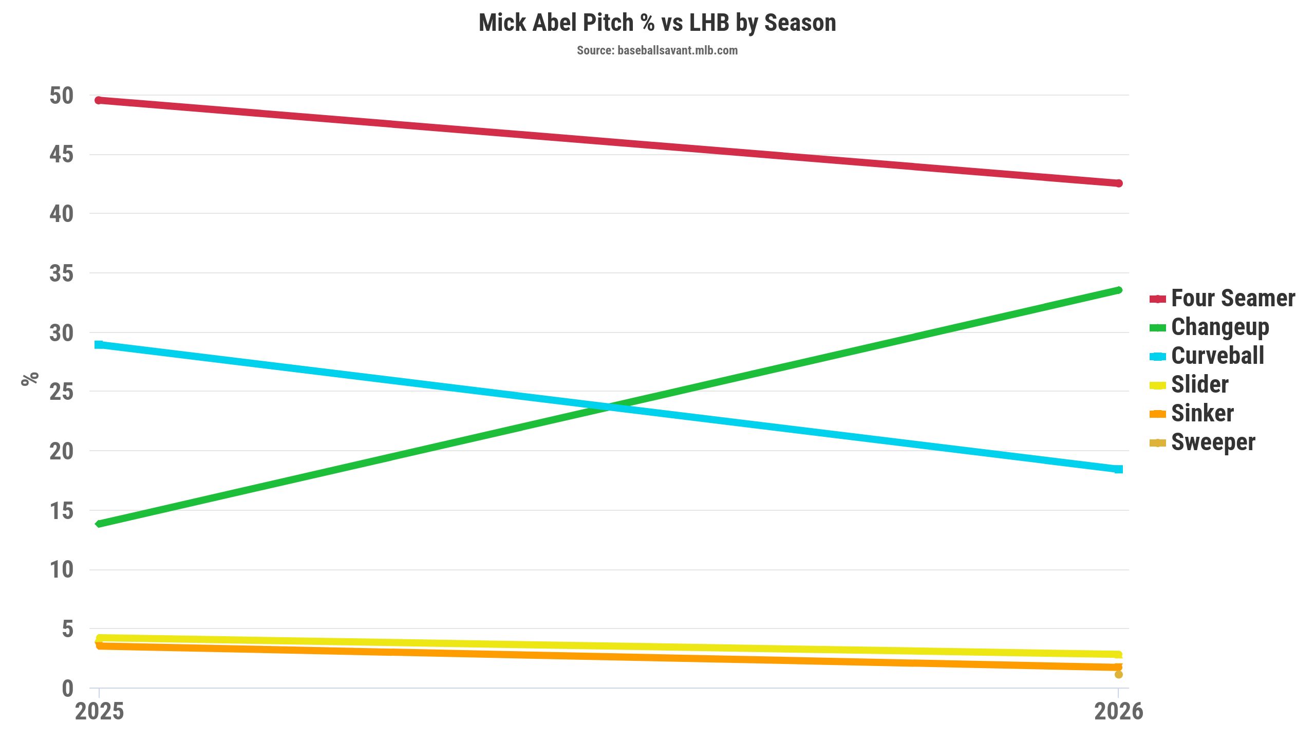 In the early 2026 sample, Abel's curveball took a step backward, going from a 14.6% swinging-strike rate in 2026 to 9.3% in 2025. He cut the curveball usage by five percentage points against right-handed hitters and 10 points against lefties in 2026.
