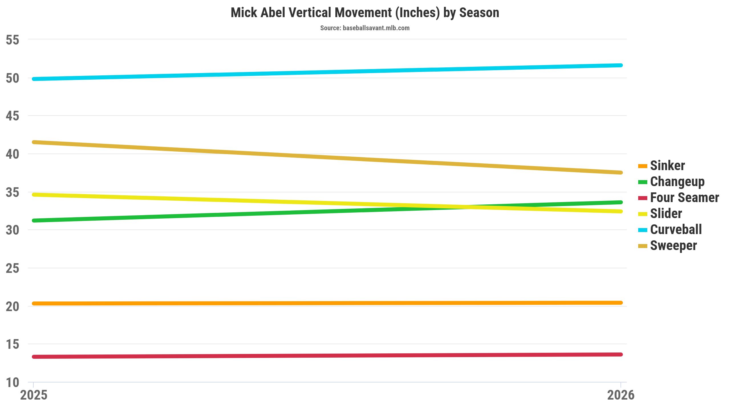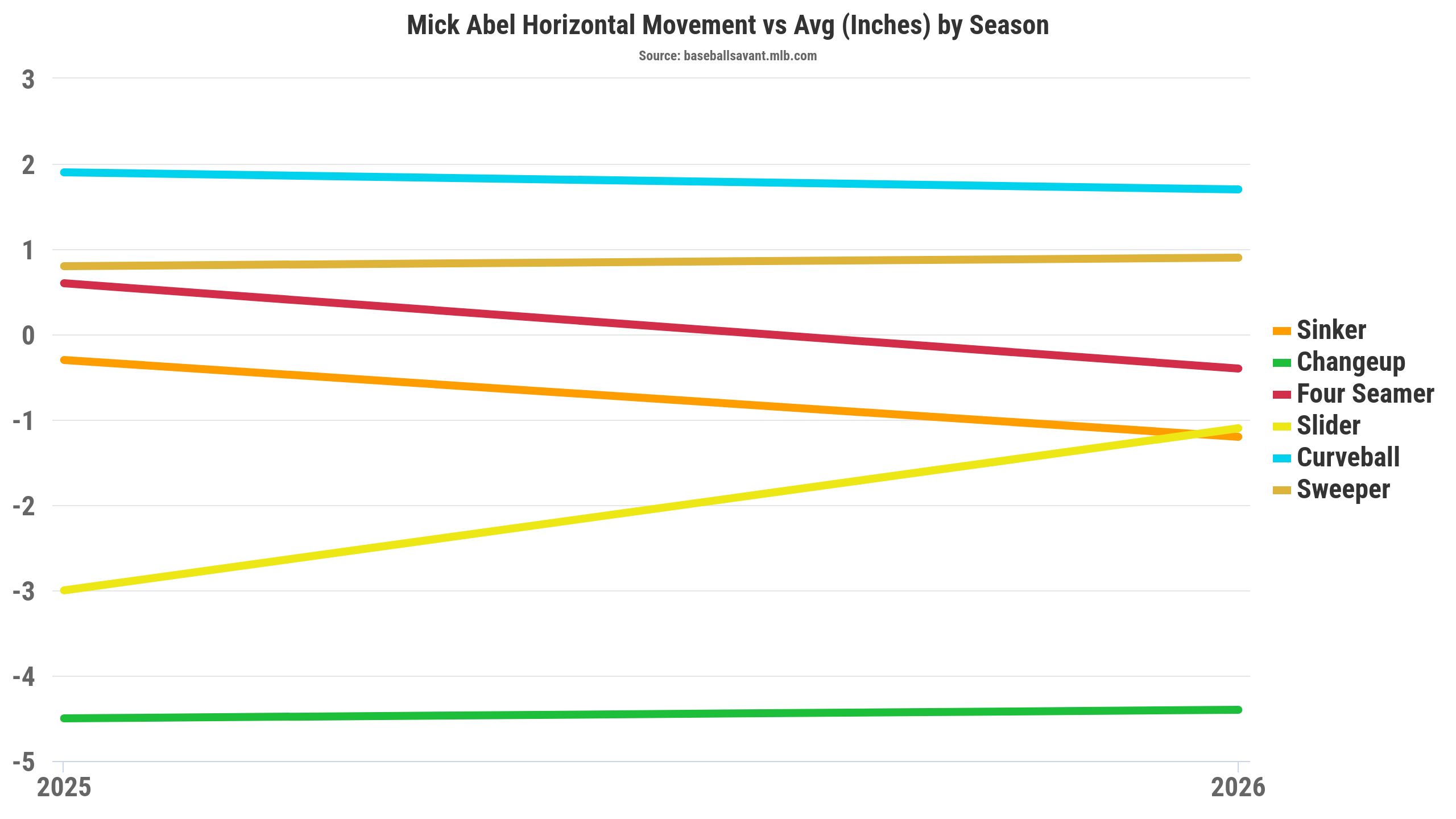With Abel throwing fewer curveballs against lefties, he increased his changeup usage to 33.5% (2026) from 13.8% (2025). He has been inducing weak contact via the changeup (.232 wOBA, .254 xwOBA) in 2026 compared to 2025 (.368 wOBA, .375 xwOBA). It makes us wonder about the changeup's movement profile.