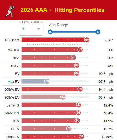 2025 MiLB stats: 88 G, 331 AB, .305 AVG, 19 HR, 68 R, 80 RBI, 10 SB, .447 wOBA, 182 wRC+
