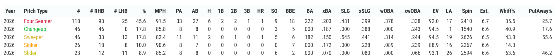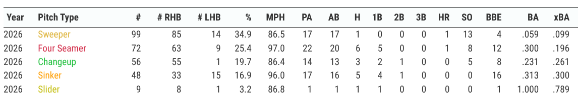 I am not quite sure why most folks were down on him this year, as he was a primary target of mine in drafts, and so far, he is paying off. He has generated a ton of swing and misses on four of his five pitches, and currently boasts a 9.8 K/9 mark. Worthy of note is the fact that he has currently posted a .133 BAA versus right-handed hitters, which is well above the .219 mark he has posted since 2024.