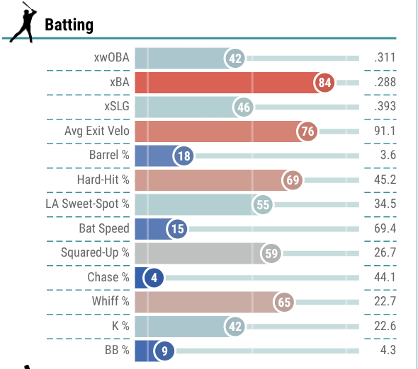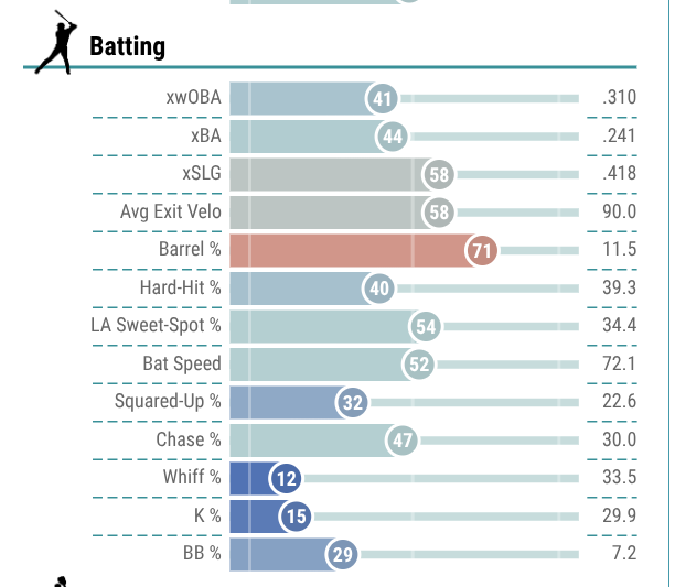 Hernandez currently ranks below the 50th percentile in terms of xwOBA, xBA, hard hit rate, chase rate, whiff rate, K rate, and walk rate, so a ton of improvement is needed here moving forward. He is a guy who has hit 25 or more home runs in each of the previous six seasons, so I would expect a turnaround here in the near future.