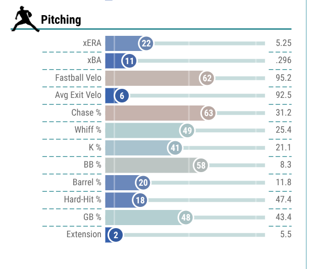 His season numbers are not much better, as he currently sits with an ERA north of 5.00 and has yet to record a win on the season. I will admit, I was not that high on Castillo entering the season, but I did not think he would struggle this much early on. He ranks below the 40th percentile in xERA, xBA, barrel rate, and hard hit rate, which are all big red flags.