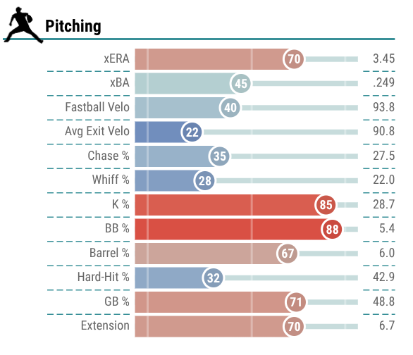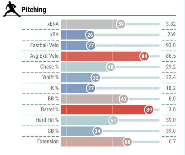 The good news for Keller is that he is limiting hard contact, as noted by the fact that he ranks in the 80th percentile or better in terms of average exit velocity and barrel rate, so improvement to the stat line could be coming. His swing-and-miss stuff has been lackluster, however, as he ranks below league average in terms of chase rate, whiff rate, and K rate.