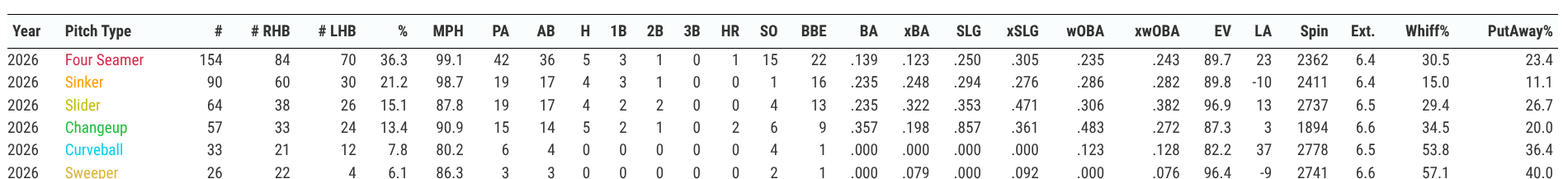 This has been good enough to rank him 30th overall after beginning the season ranked 1,547th. Clearly, he has progressed quite well. A lot of his success has come via his four-seam fastball, which has generated a 30.5% whiff rate. He has actually had a ton of swing-and-miss success with a majority of his pitches, as five of his six pitches generate a 29% or better whiff rate.
