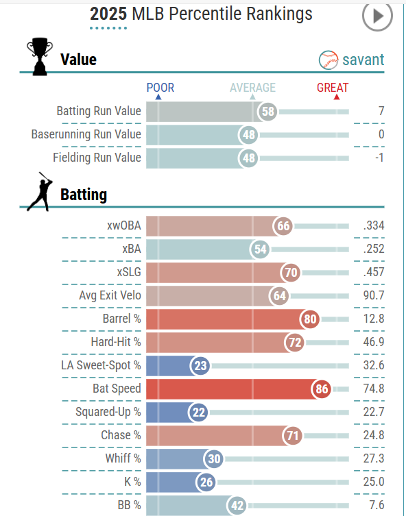 Baty seems to be a forgotten man these days, but he could be primed for a breakout with the New York Mets this season. In 432 plate appearances in 2025, Baty hit .254 with 18 home runs, 50 RBI, 53 runs, and eight stolen bases. Take a look at his Statcast data below.
