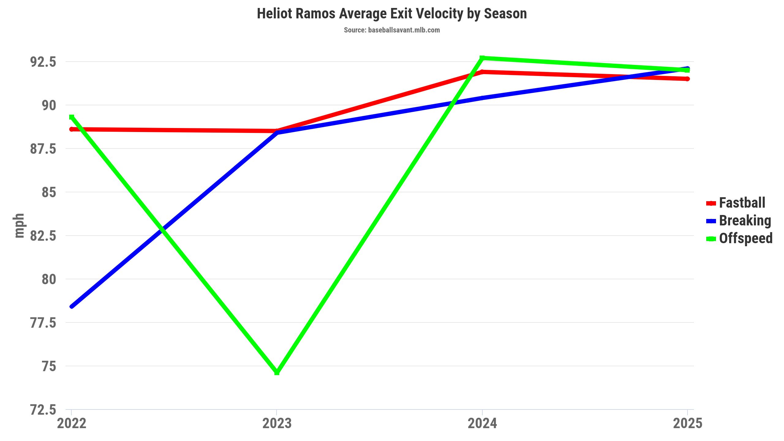 What I like when I dig in is that Ramos hits the ball hard; his average exit velocity is elite (see below). Digging a bit deeper, the K% has decreased annually, reaching a career low of 22.7% in 2025. He has elite bat speed as well, and he's entering his age-26 season.