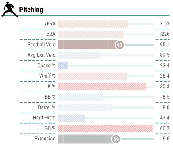 While he did not qualify per Statcast metrics, he did post some pretty solid numbers. Overall, he posted a very respectable 3.53 xERA. Additionally, his 30.3% K rate was outstanding. He also managed to keep the ball on the ground, as noted by his 60.2% ground-ball rate.