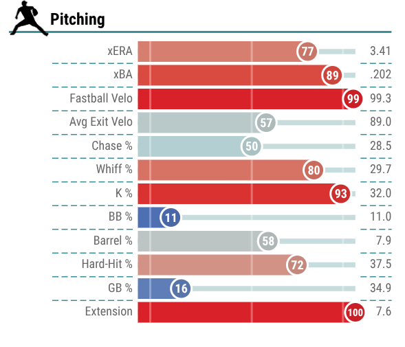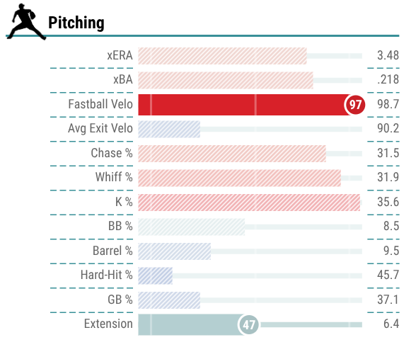 He has immense strikeout upside, as noted by 88 punch outs across 79 1/3 IP last season, and his 30.2% chase rate had him ranked in the 74th percentile of the league, so he was good at getting hitters to swing outside of the zone.