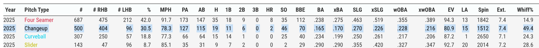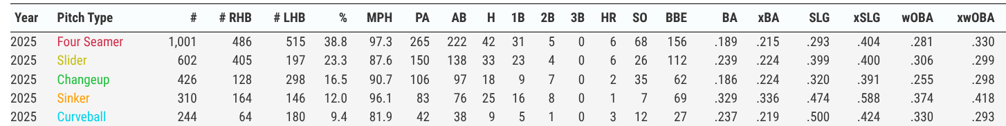 One area we will also want to see further improvement in 2026 is his walk rate. In 2025, he posted an 11% walk rate, which ranked him in the 11th percentile. This directly corresponds to his low chase rate, as he clearly was not getting hitters to swing out of the zone. This happens with young pitchers and is not something to be overly concerned about.