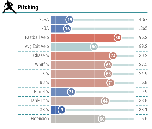 Unfortunately, the strikeouts did little to help his ERA, as he finished with an ugly 5.56 ERA and a lackluster xERA of just 4.67. One additional positive to note is the fact that he posted just a 6.8% walk rate, which ranked him in the 71st percentile, so at least he does not beat himself.