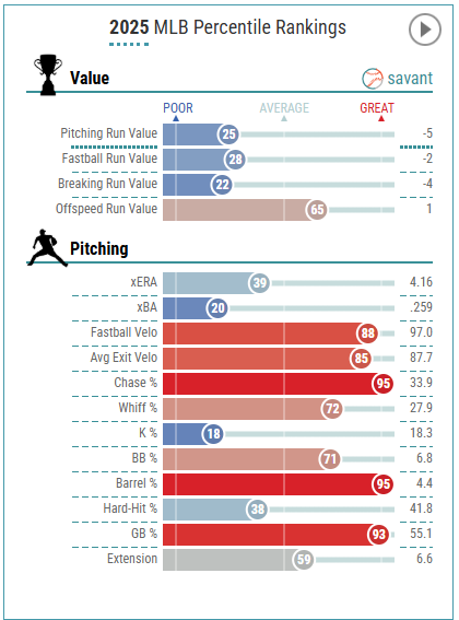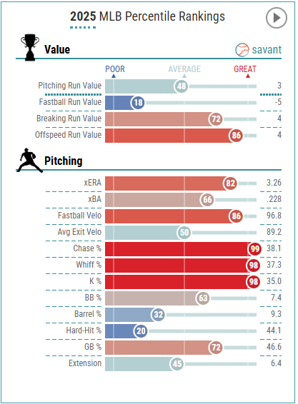 Jax has been behind two excellent closers in Fairbanks and Jhoan Duran. He could shed that shadow and be in the spotlight. Check out his Statcast below. A 35% K%, adding with insane whiff and chase percentages, is video game stuff.
