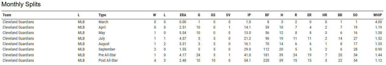 Look at his splits below. Once Cantillo moved to the rotation in July, you can see the results. What caught my eye were the four wins, the 2.48 ERA, and the 1.12 WHIP. The strikeout rate diminished, but he still got 54 punchouts in 54 innings.