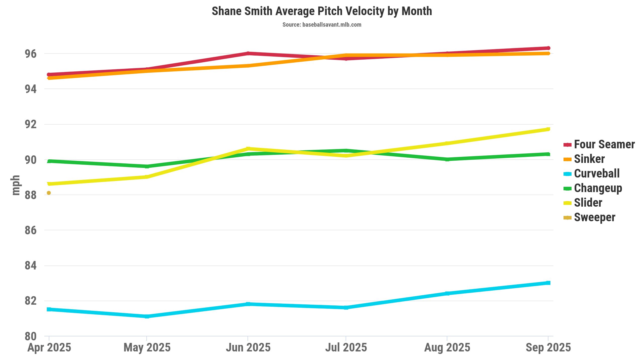 Smith gained velocity as the season went on, while many other starting pitchers faltered and lost velocity. See for yourself below. The fastball velocity helped him generate more whiffs, and he cut his walk rate in the season's second half, which led to better results.