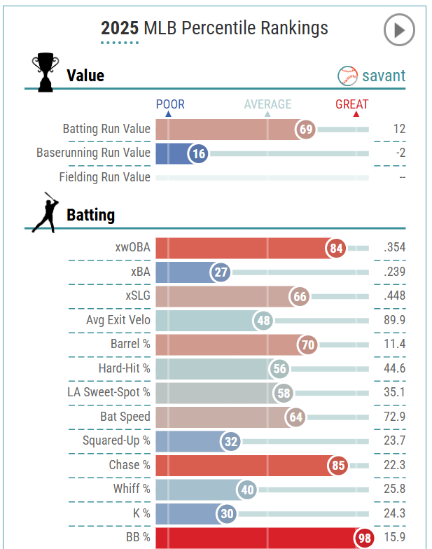 I am not sure why Beck is not being drafted higher this winter. The 29.6% K% really seems to put people off. Can he improve that? Beck quietly put up an encouraging season in 2025, hitting .258 with 16 home runs, 53 RBI, 62 runs, and 19 stolen bases in 148 games.