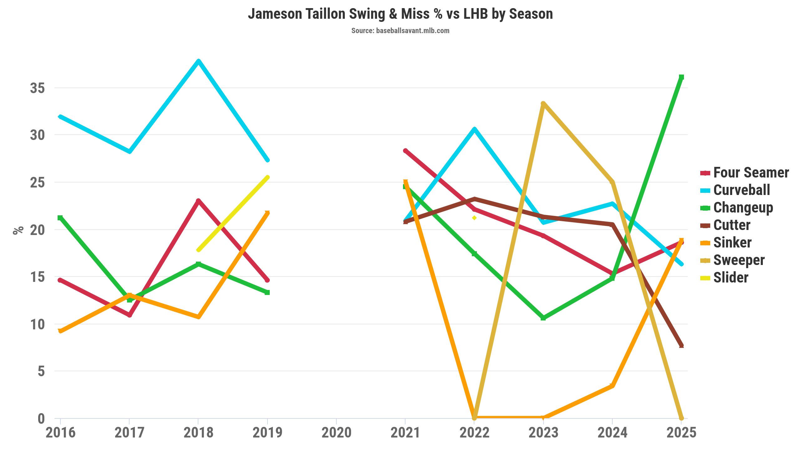 Taillon's sweeper remained the other primary pitch for whiffs, with a 16.4 percent swinging-strike rate. However, the expected results for the sweeper should regress, with a .368 wOBA (.260 xwOBA) in 2025 after a .205 wOBA (.235 xwOBA) in 2024 against right-handed hitters.