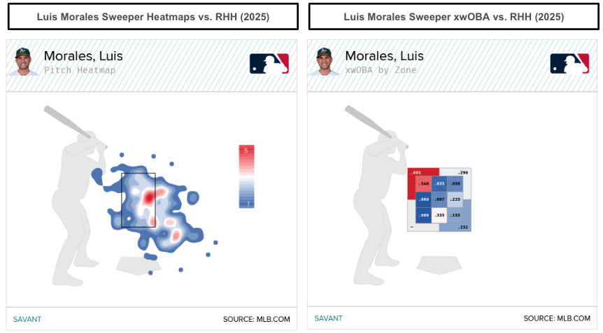 Morales's sweeper dominated against right-handed hitters, inducing a 16 percent swinging-strike rate while allowing a .186 wOBA (.181 xwOBA). Theoretically, that gives Morales at least one pitch to find success against right-handed hitters. We want to see Morales develop the changeup. However, the changeup is a mixed bag, allowing weak contact, with a .102 wOBA, though the .269 expected wOBA suggests the outcomes will regress.