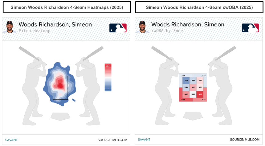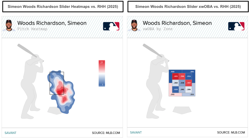 Woods Richardson's slider found success against right-handed hitters, allowing a .223 wOBA (.274 xwOBA), though it doesn't pop from a movement profile standpoint. That's further evident in the slider, which generated only a 12.4 percent swinging-strike rate in 2025. When a pitcher finds success with pitches that lack an above-average movement profile, we could speculate on optimal command and location.