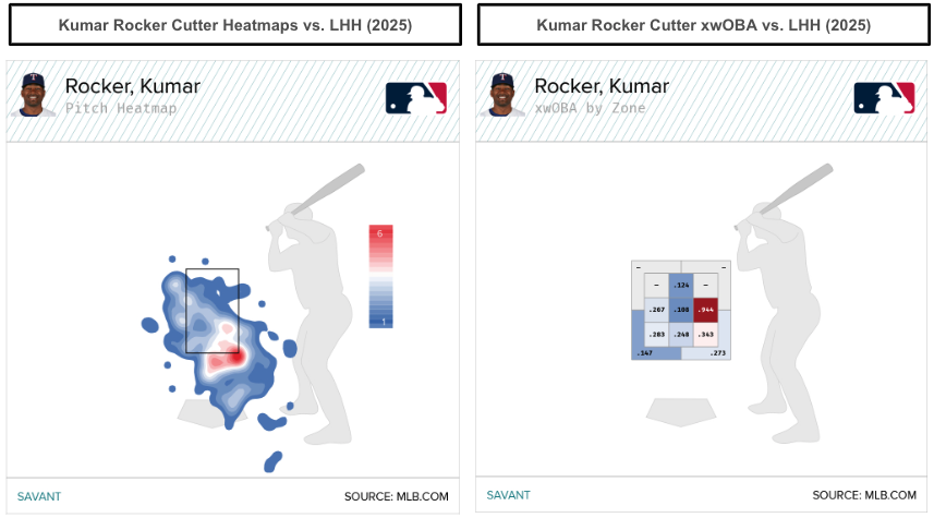Rocker's cutter looks like a harder gyro-like slider that he pounds low and inside to left-handed hitters. Though the cutter seems like a mediocre offering, it seems to have helped with better outcomes via the slider, especially against right-handed hitters (.147 wOBA, .186 xwOBA) in 2025. That's further evident by Rocker's cutter (18.9 percent) and slider (19.4 percent), both with a swinging-strike rate around 19 percent in 2025.
