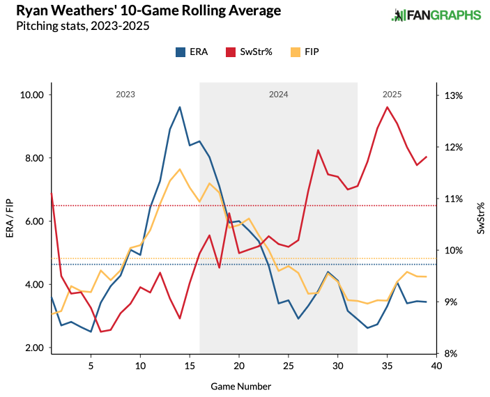 Why in the world would we target a starting pitcher who missed nearly 150 days on the injured list with two significant injuries? Weathers started the season with a strained forearm, causing him to miss nearly two months. Then, Weathers dealt with a shoulder issue that turned into a left lat strain in early June, leading to two more months on the injured list.