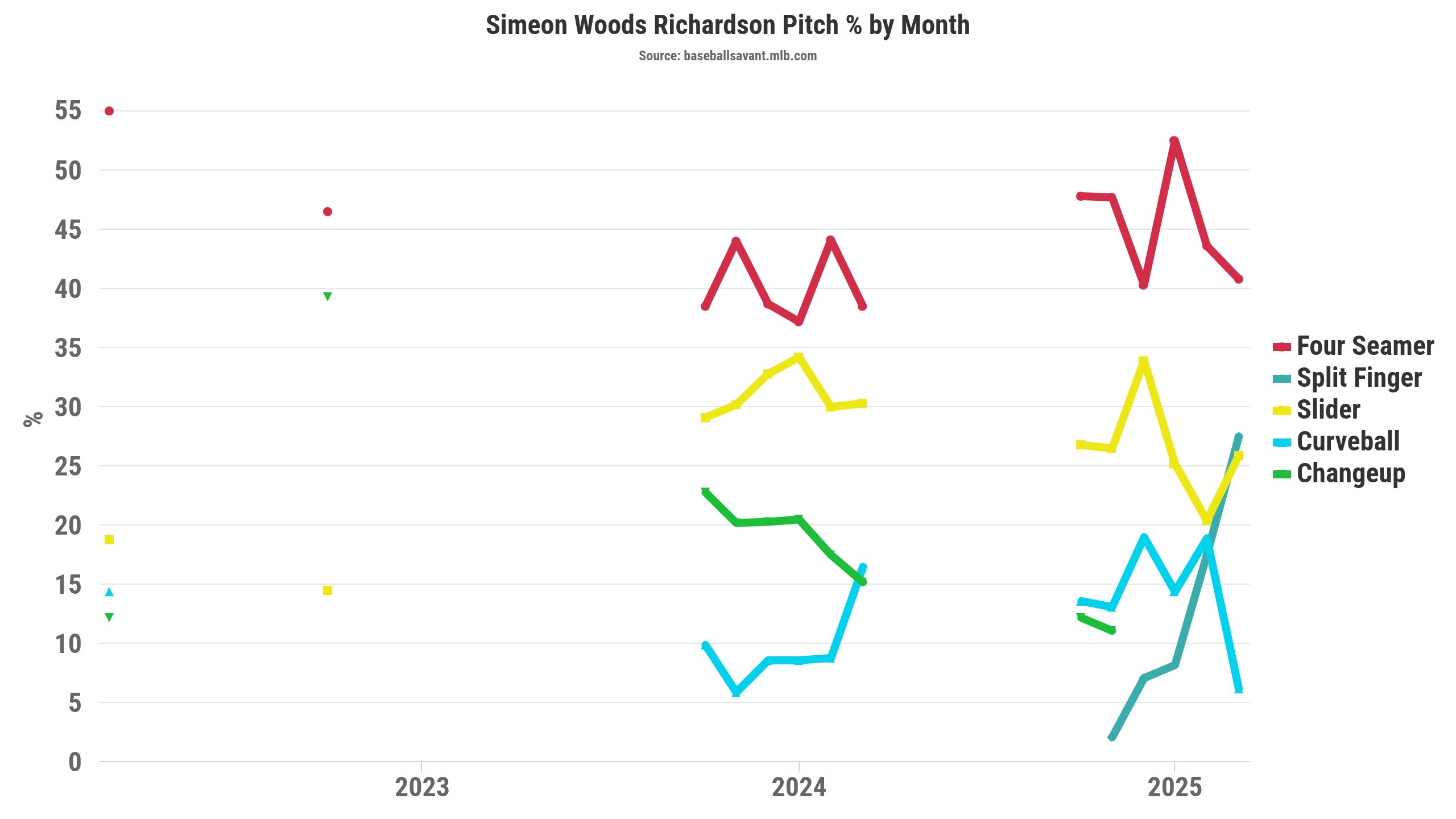 That's notable because the splitter was a new pitch for Woods Richardson in 2025. In September, Woods Richardson's splitter elicited an 18.8 percent swinging-strike rate. Furthermore, Woods Richardson's splitter allowed a .103 wOBA (.139 xwOBA) against left-handed hitters, making it a near-elite offering to opposite-handed hitters.
