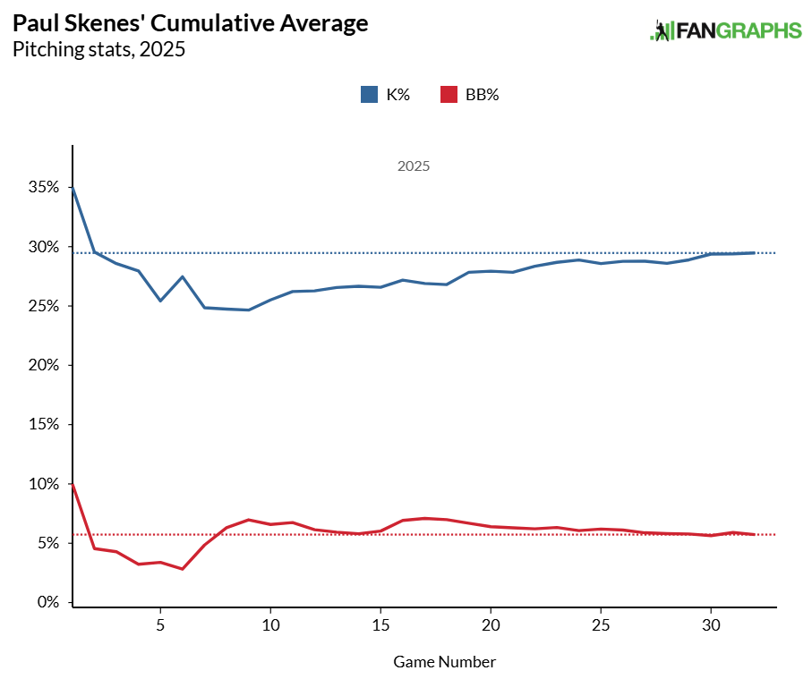 Skenes also saw his strikeout rate drop. In 2024, his 33.1% K% ranked in the 95th percentile. In 2025, Skenes had a 29.5% K% (89th percentile). Skenes' strikeout rate improved as the season wore on, helping to allay fears that he'd struggle towards the end of his first full season in the majors.
