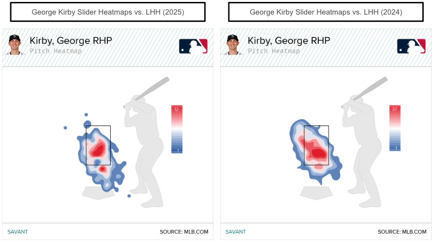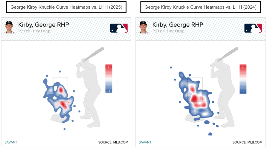 Besides Kirby's splitter movement profile changing, the curveball dropped 2-3 inches more in 2025. That's partly because Kirby has been throwing the curveball 1-2 mph harder in each of the past two seasons. Theoretically, Kirby throwing a harder curveball would lead to less vertical movement. As one would expect, Kirby's curveball locations haven't been as precise in 2025 against left-handed hitters after dealing with the injury.