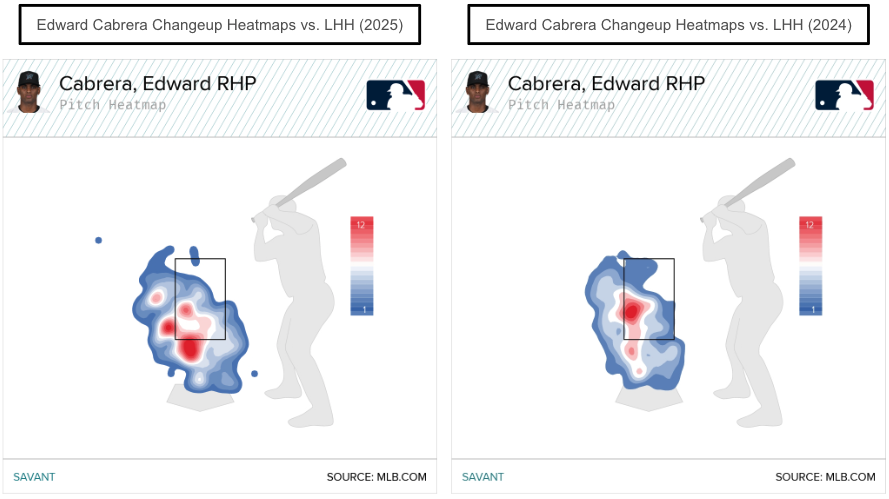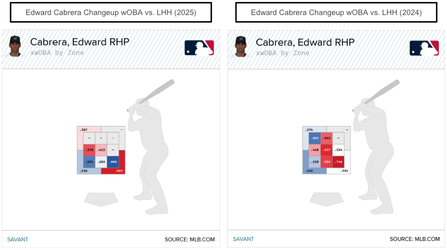 Cabrera's changeup has been one of his better pitches against left-handed hitters. His changeup allows a .259 wOBA (.283 xwOBA) in 2025 against lefties, with the curveball being his best one, evidenced by the .175 wOBA (.189 xwOBA). He has been locating the changeup low and away to left-handed hitters in 2025, which is slightly different from his changeup locations in 2024.