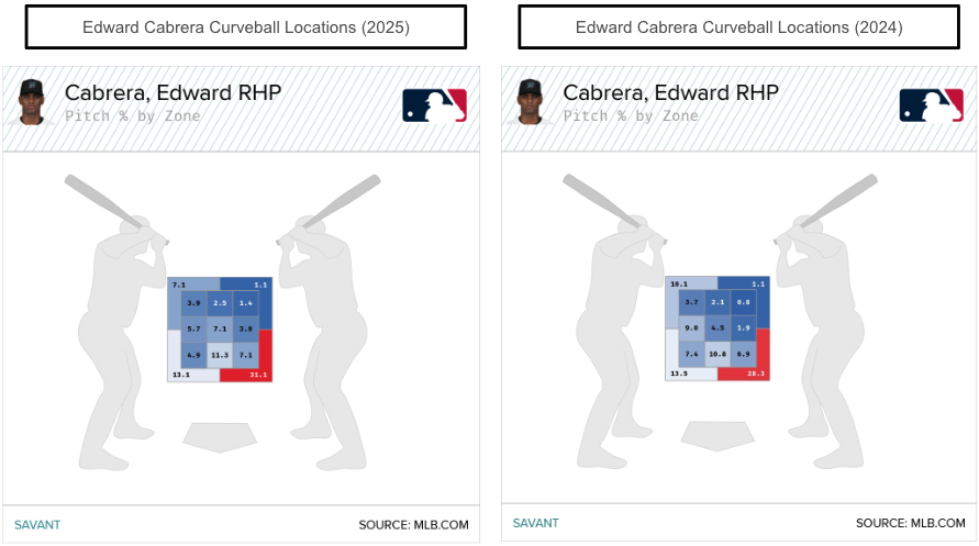Cabrera's curveball allowed a .175 wOBA (.189 xwOBA) against left-handed hitters, with a .235 wOBA (.181 xwOBA) versus righties in 2025. That's been better than the curveball results against lefties (.324 wOBA, .292 xwOBA) and righties (.265 wOBA, .306 xwOBA) in 2024. Besides the curveball movement profile difference, one would guess there might be location differences.