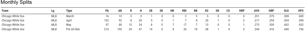I love Meidroth, and not just because of my undying White Sox loyalty. See below. I cherry-picked some stats to make the case for Meidroth. He doesn't strike out, and he takes walks. His on-base percentage is a robust .380. He gets on base, and he steals bases. He has seven steals this month and is hitting .299. He will not hit a bunch of home runs, but he can help in the other categories while also boasting eligibility at three different infield spots. There is value here.