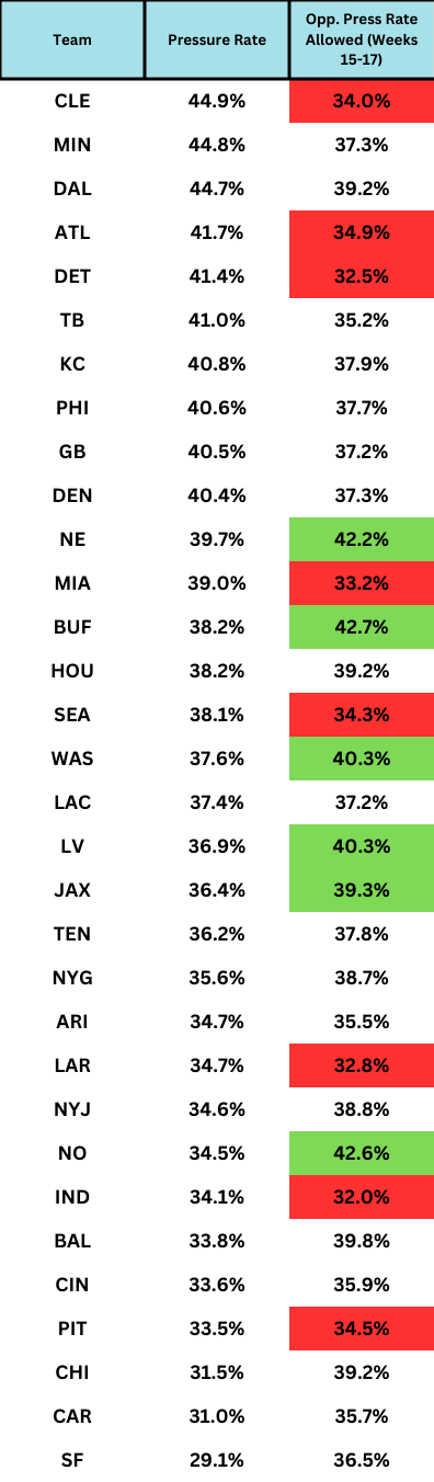 One more thing we'll look at is pressure rate. While pressures lead to sacks, they can also force turnover-worthy throws or fumbles by the quarterback. We'll also compare a team's pressure rate to the average pressure rate allowed for their opponents.
