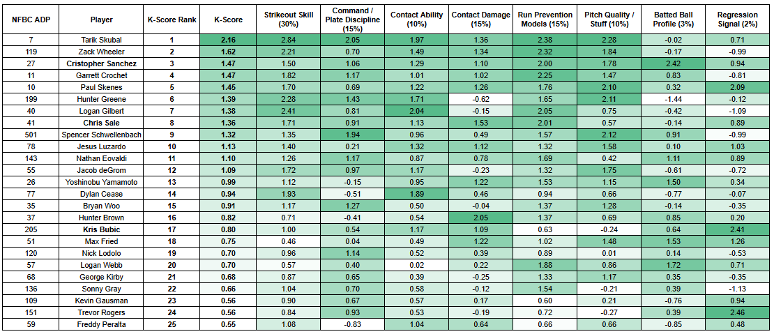 Zack Wheeler, Logan Gilbert, Chris Sale, and Nathan Eovaldi all rank in the top-11 in K-Score, and they're all pitchers I'm highly interested in at cost this season. Dylan Cease, Hunter Brown, Logan Webb, and George Kirby are my other top targets that popped in this metric.