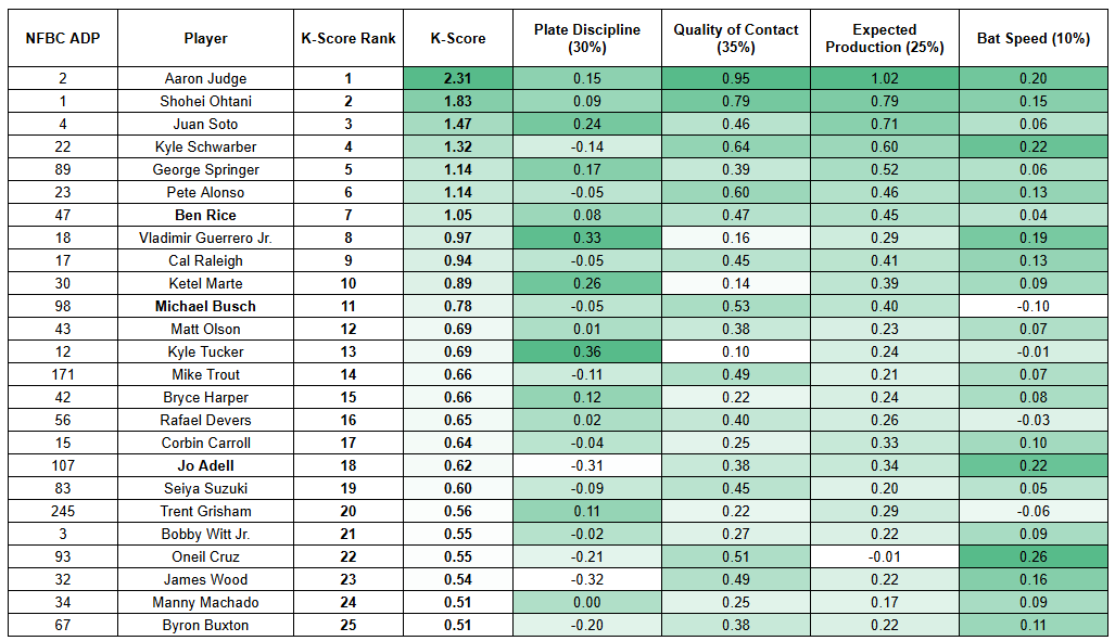 Much like the starting pitcher K-Score, it's a beautiful sign that we have established superstars at the top of the board in Aaron Judge, Shohei Ohtani, and Juan Soto. Kyle Schwarber and Pete Alonso also feel like they belong in this group, but we already know what they're all about. Let's highlight a few surprises emerging in this metric.