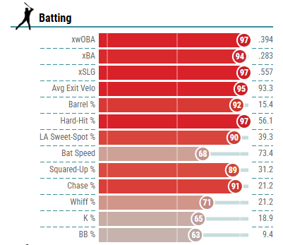 • Contact Damage (15%): Barrel %, Average Exit Velocity, Hard Hit %