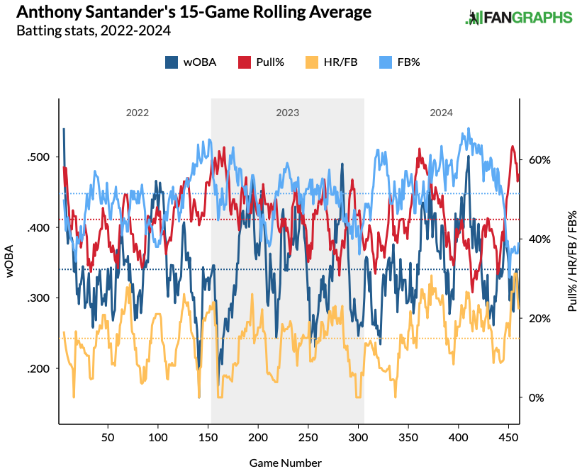 When a hitter like Santander boasts elite power skills, we'll see a higher xBA, especially considering he makes above-average contact rates. The main issue with the batting average catching up to the xBA involves the pull-heavy (44.8 percent) and flyball (54.8 percent) approach. That typically doesn't bode well for batting average with the extreme flyballs.