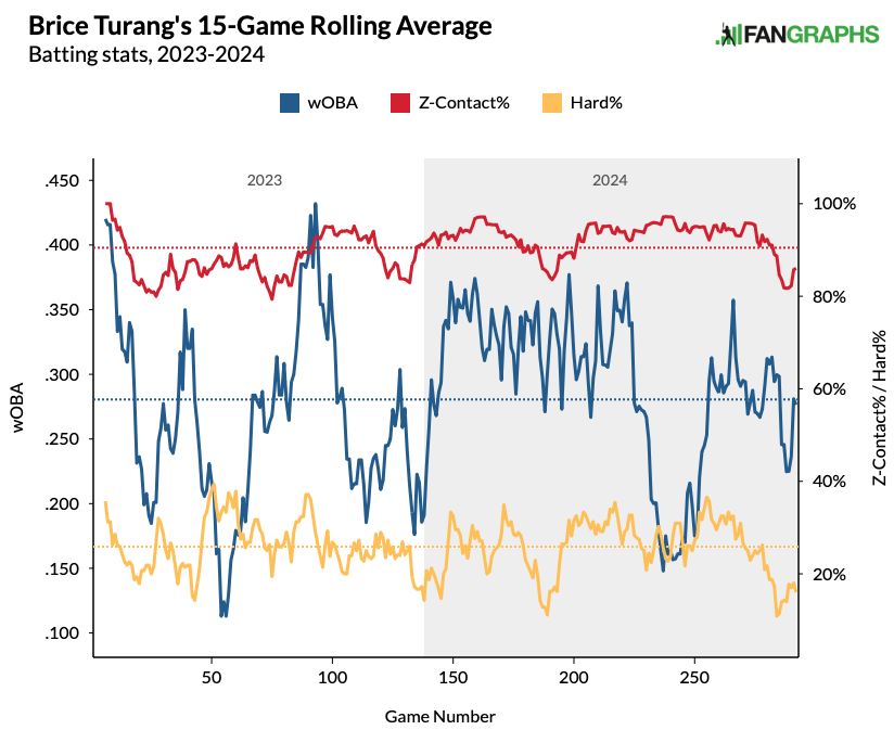 Defense, speed, and plate discipline make up Turang's profile. After Turang had a 27 percent stolen base opportunity rate in 2023, it jumped to 35 percent in 2024. That led to a 50-steal season by Turang, contributing to 23 percent of the Brewers' stolen bases. His elite zone contact rate of 92.2 percent keeps his floor high.