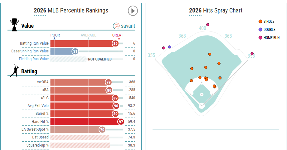 The youngster is hitting .381 and spraying the ball all over the field with great results. He's not a true "home run hitter" but has a big swing that results in a lot of incredibly hard contact.