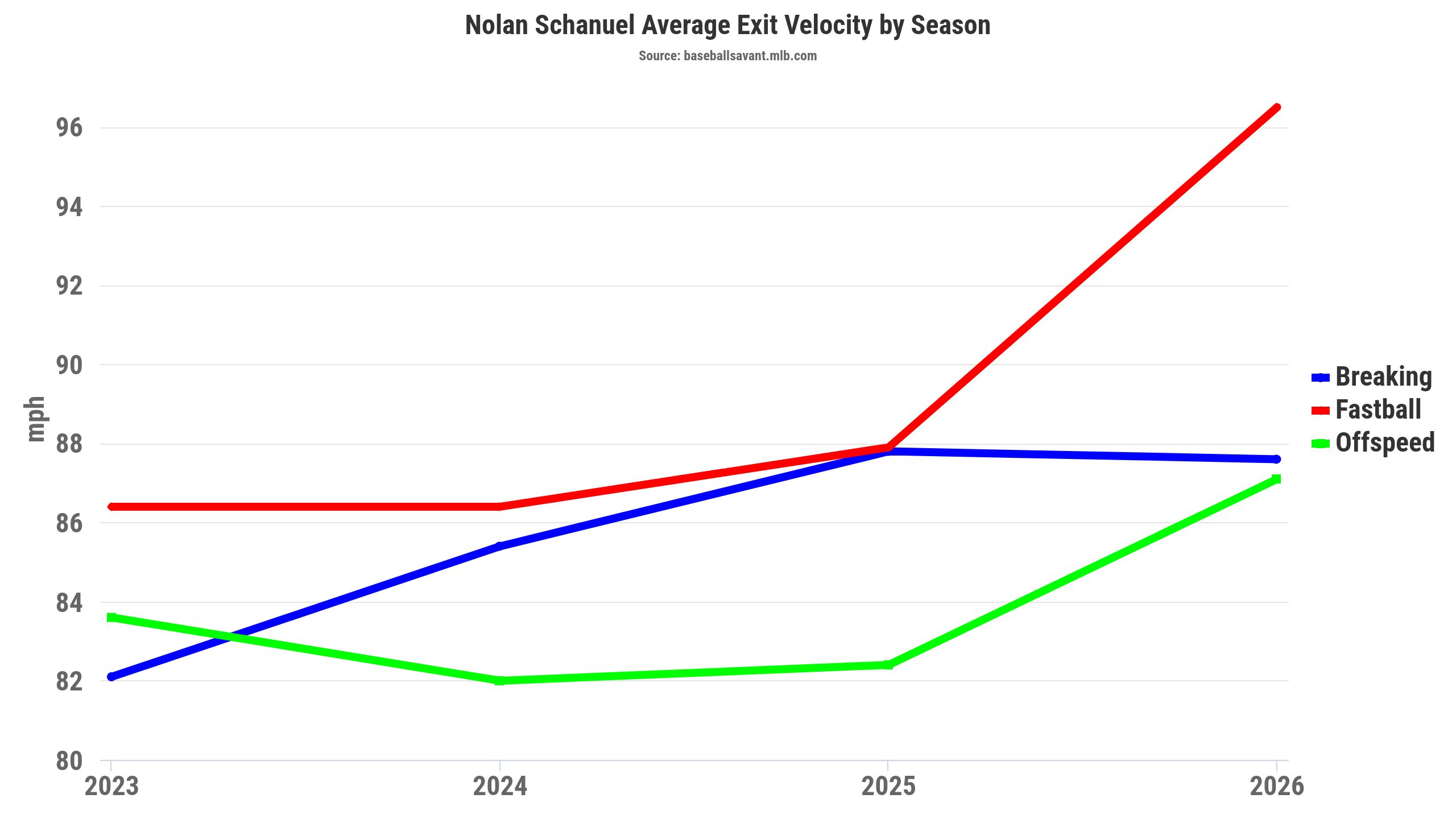 See the chart below as his exit velocities climbed a bit each year. You know he is going to get the at-bats in a lineup that does not have any other first base options. Schanuel should help your team with batting average this season, and hopefully swat a few more homers.