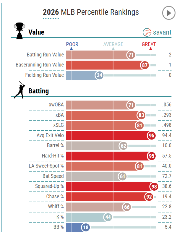 Look at his Statcast below. Check out the hard-hit and the squared-up percentages, and you can see his success is no fluke. I love that Keith has multiple position eligibility at three infield positions as well. He will not be on the waiver wire much longer. Grab him now.