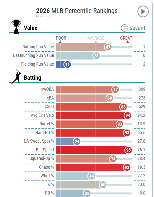 Stott is really close to breaking loose. He is only hitting .204 and has no home runs, but he does have four stolen bases already this season. His xBA is .266, and his hard-hit percentage is 50%, with a 37.2% squared-up percentage. So, the results are not there yet, but could be imminent.