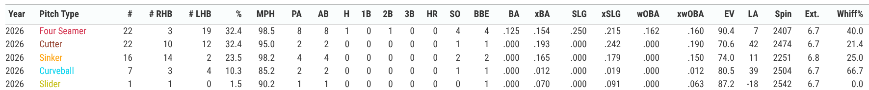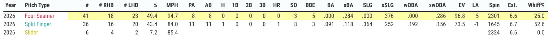 This is extremely impressive to be able to use that fastball to generate those types of swing and misses, and he should be able to have similar success today against a free-swinging Seattle Mariners squad. Thus far in 2026, Seattle is posting a K rate of nearly 28%, which ranks them seventh-worst in the league.