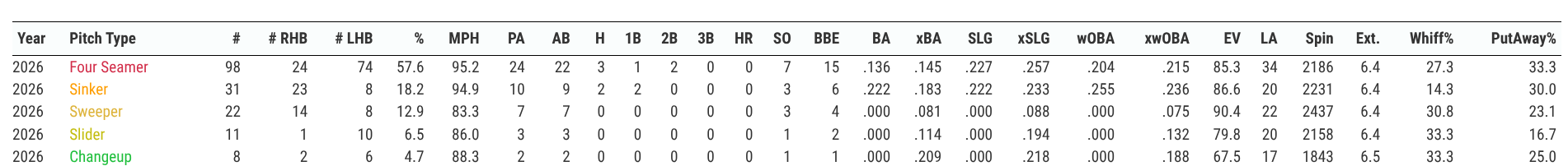 Bryan Woo probably has the most strikeout upside of any pitcher on today's slate. Thus far in 2026, he has struck out a total of 15 batters across 13 innings pitched, while allowing just two earned runs. He has found a ton of success with his offspeed pitches, as noted by the fact that he has generated a whiff rate north of 30% on each of his sweeper, slider, and changeup.